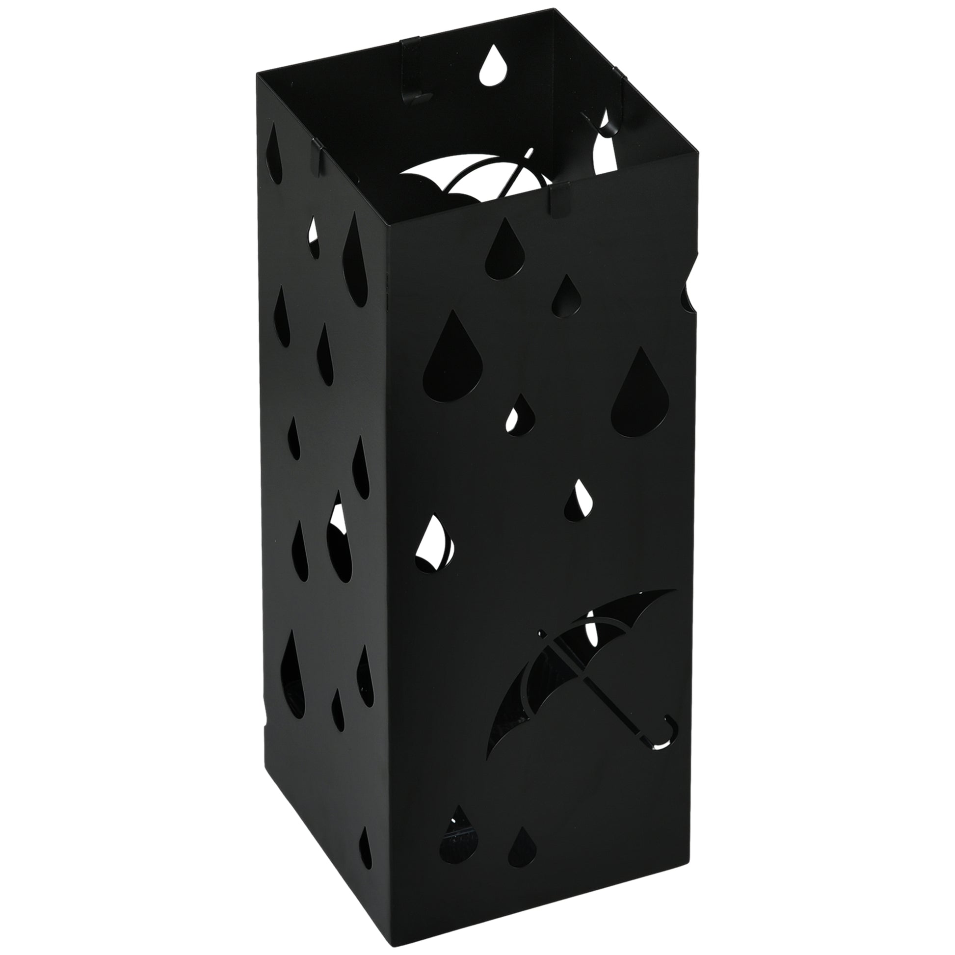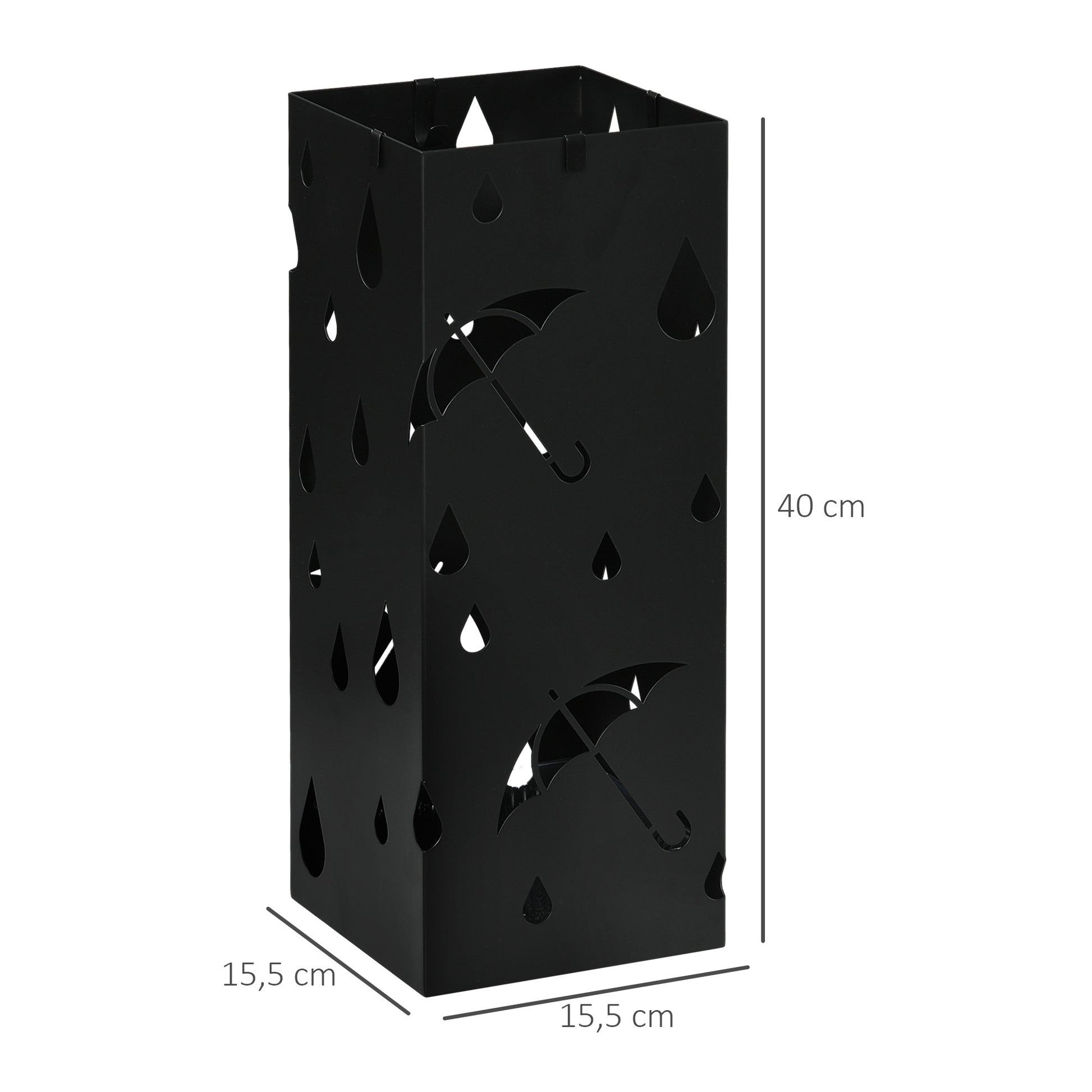 Regenachtige dagen vereisen paraplu's, die vaak natte grond achterlaten. De stijlvolle en functionele HOMCOM-paraplustandaard voor de gang creëert een speciale opbergruimte voor parasols. De paraplustandaard is gemaakt van stevig, gegalvaniseerd staal en is bestand tegen roest. Met afmetingen van 15,5 x 15,5 cm houdt hij twee grote paraplu's vast en biedt hij vier haken voor kleinere exemplaren. Bevat een afneembare bodembak voor het gemakkelijk verwijderen van vloeistof.