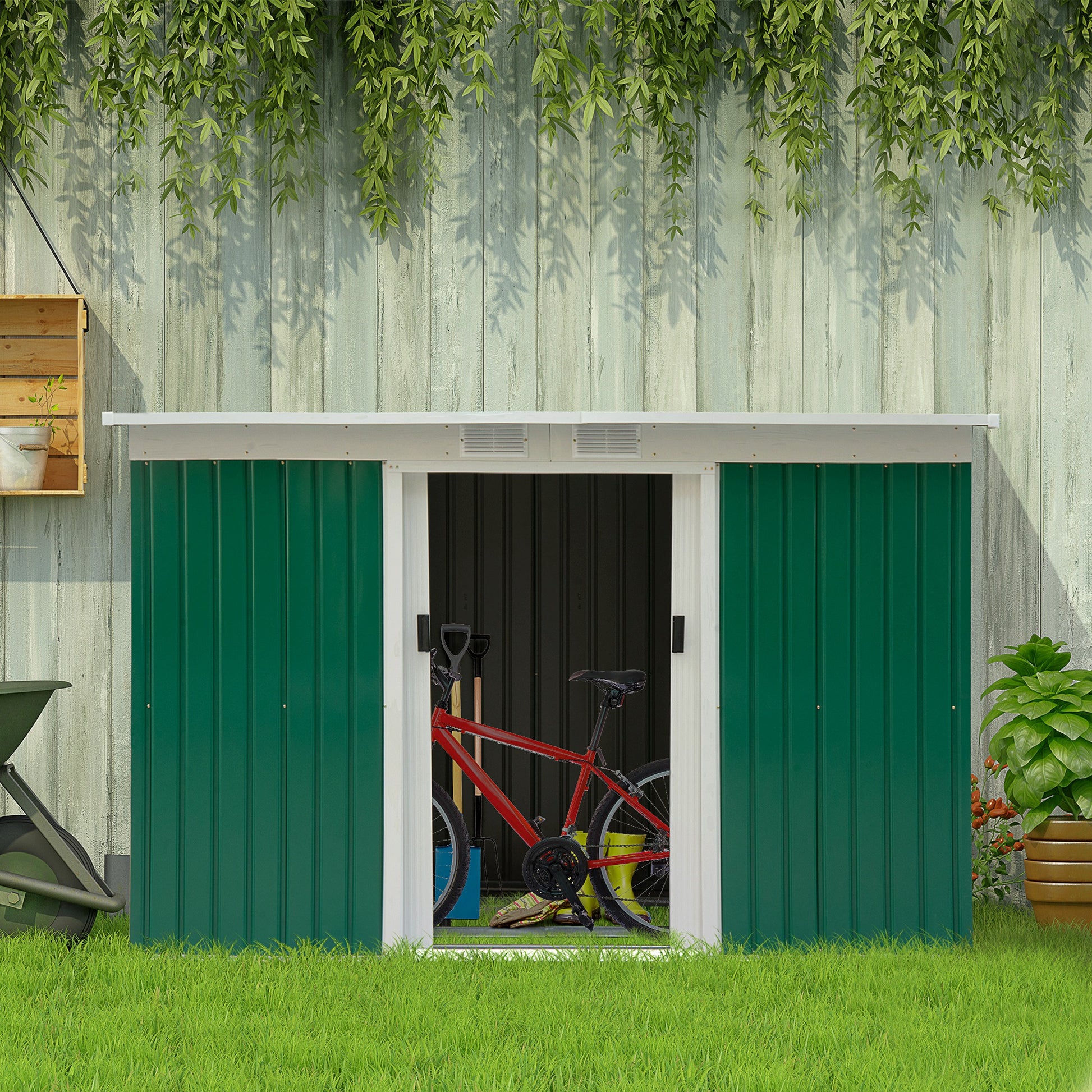 Outsunny Metalen Tuinhuis 6,3 m³ 280x130x172 cm Gereedschapsschuur met lessenaarsdak, Schuifdeur, Weerbestendig Tuinhuis, Tuinhuis voor Buiten, Kast voor de Achtertuin, Buitenruimte, Antraciet, Donkergroen