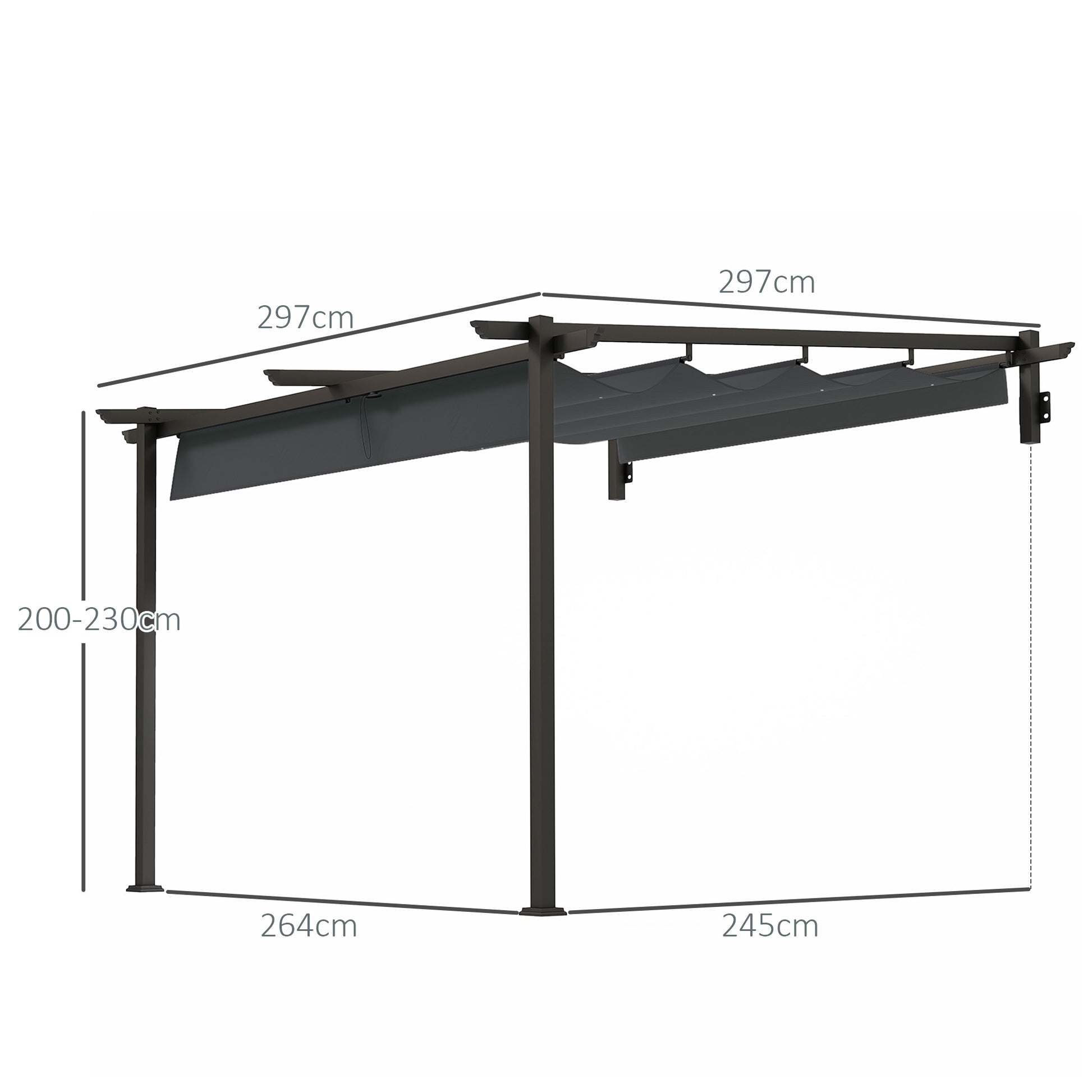 Outsunny Paviljoen, 3 x 3 m Pergola, Winddicht Terrasoverkapping, Wandmontage, Verstelbaar Dak, voor Tuin, Terras, Donkergrijs
